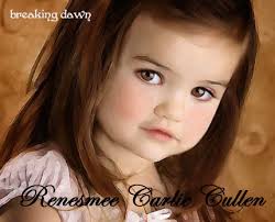 Celé meno: Renesmee Carlie Cullen Status: Poloupír Dátum narodenia: 11.septembra, 2006 Farba vlasov: bronzová, kučeravé Farba očí: čokoládová Osobné nadanie : pomocou dotyku, vie ukázať čo chce, čo si myslí a pod.. Rodinný príslušníci: rodičia Edward a Bella, "teta" Alice a Rosalie, "ujo" Japser a Emmett, partner Jacob. Záľuby: lov, rodina, pohyb. Osobná história Renesmee sa narodila Belle a Edwardovi , cca 11septembra. Jacob Black sa do nej zamiloval, a ona do neho takisto. Je poloupír. Spoly človek, spoly upír. 2. Nahovoriť jej, že je jedovatá 4. ......... keď sa o to pokúsi povedať jej, že upíri jed Jacoba zabije 6. .... a potom sa zobudiť a povedať jej, že to bol iba zlý žart 8. Kúpiť jej na narodeniny erotické spodné pádlo 9. ...... napísať naň ( Pre Jacoba ) 10. ........ a do venovania napísať ( Od Jacoba ) Fotky:ČO MÁ RENESMEE ZAKÁZANÉ :